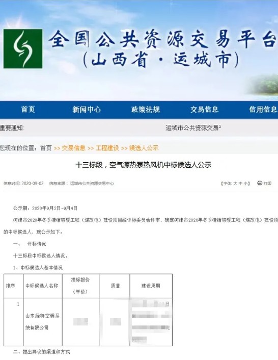 2020年9月2日,山西省运城市公共资源交易中心公示了河津市2020年冬季清洁取暖工程(煤改电)建设项目的中标结果,绿特位列榜单,实力中标。