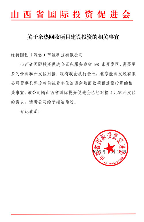 2023年4月20日,山西省国际投资促进会执行会长郭珍珍一行莅临绿特国创进行考察,绿特国创总经理张总、营销总监王总进行接待,并陪同参观考察。