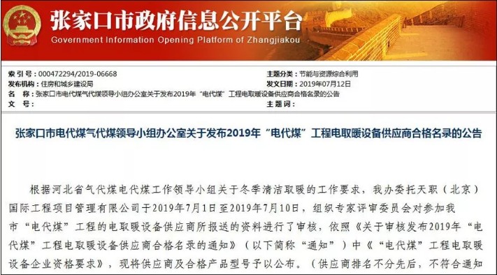 2019年7月12日,张家口市电代煤气代煤领导小组办公室发布了2019年“电代煤”工程电取暖设备供应商合格名录的公告,绿特携旗下产品地源热泵热风机、低温空气源热泵热风机、低温空气源热泵冷热水机组成功入围2019年“电代煤”工程电取暖设备供应商合格名录。
