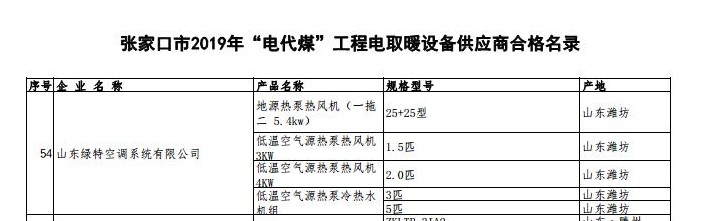 山东绿特空调系统有限公司再传喜报,成功入围张家口2019年“电代煤”工程电取暖设备供应商合格名录。