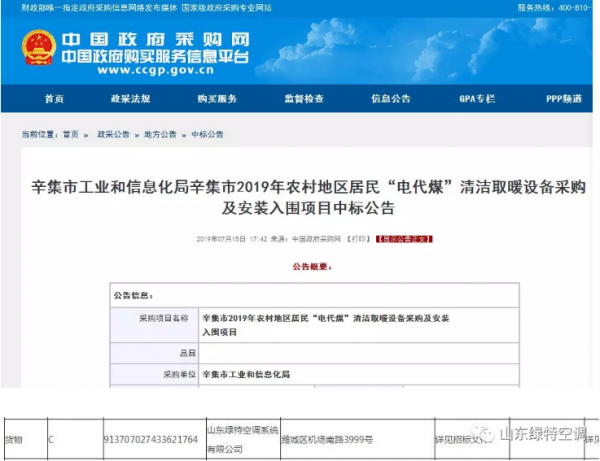 2019年农村地区居民取暖“电代煤”电取暖设备采购及安装入围项目中标公告结果正式公示,绿特凭借先进的生产设备、雄厚的技术实力成功中标!